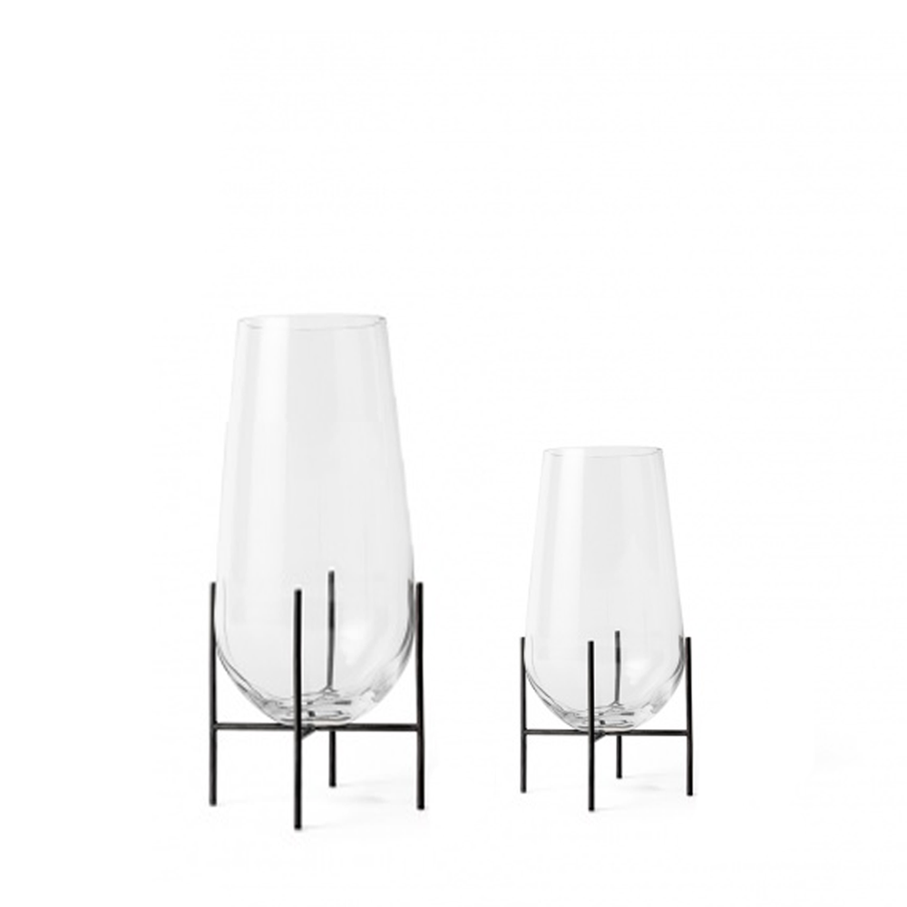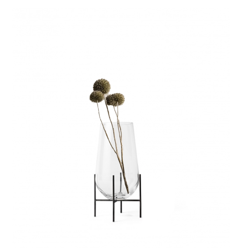 Florero moderno de vidrio borosilicato con base metálica.
