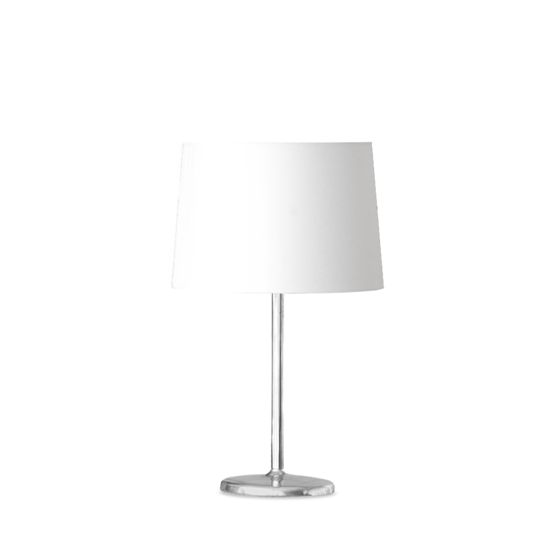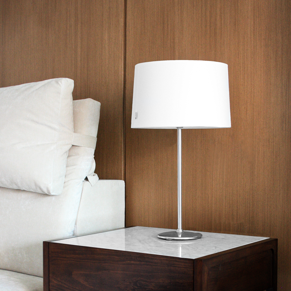 CompararLámpara de mesa con base de aluminio acabado espejo y pantalla de tela color blanco.