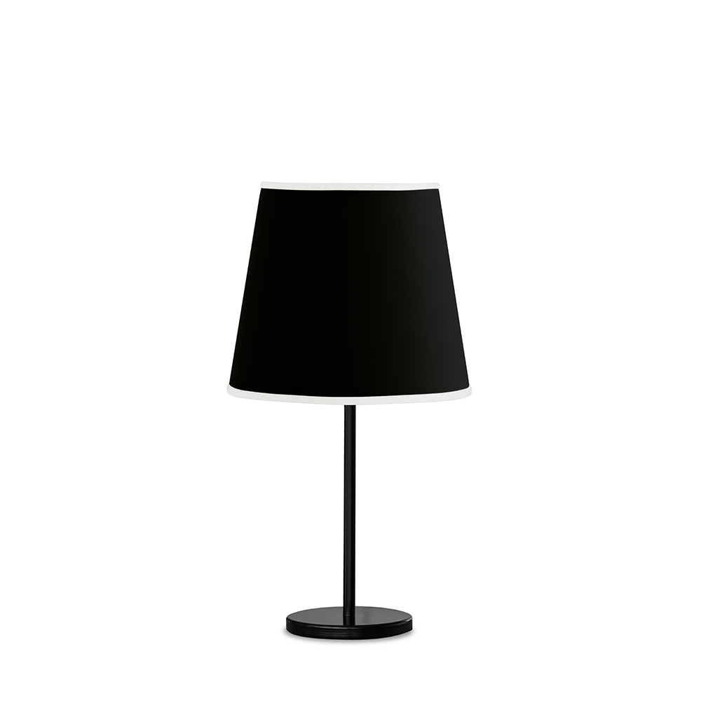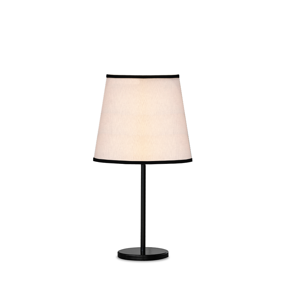 CompararLámpara de mesa con base de metal y pantalla de tela con vivo en contraste.
