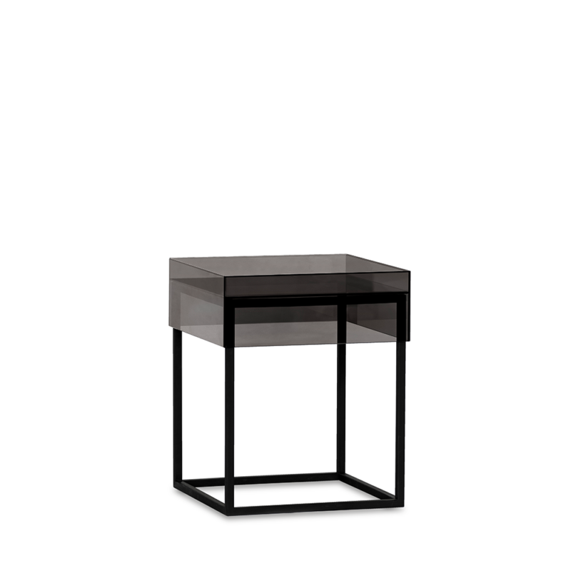 Hemos diseñado la cubierta de esta mesa en cristal ahumado, material que le brinda una transparencia y elegancia única. La base metálica es muy resistente.