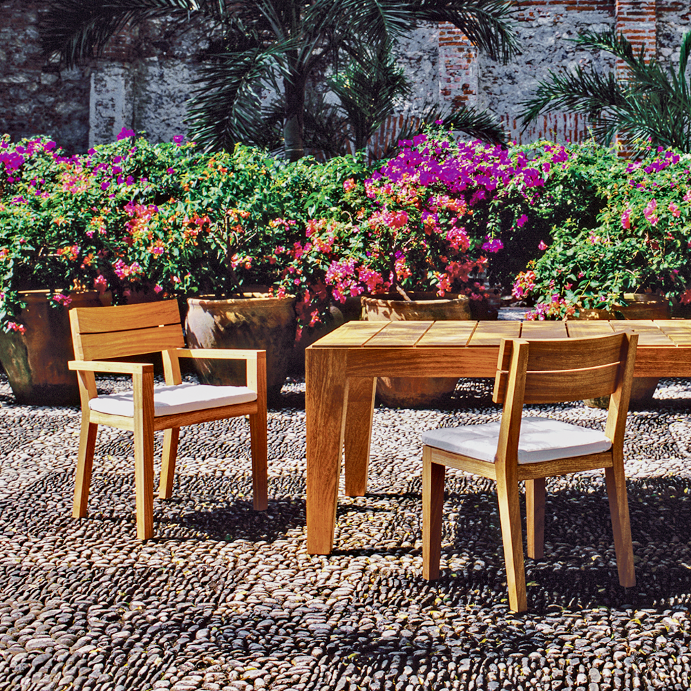 Materiales: madera tropical Bojomah sólida / Acojinamiento de tela Sumbrella y espuma especial para exterior que no conserva la humedad.