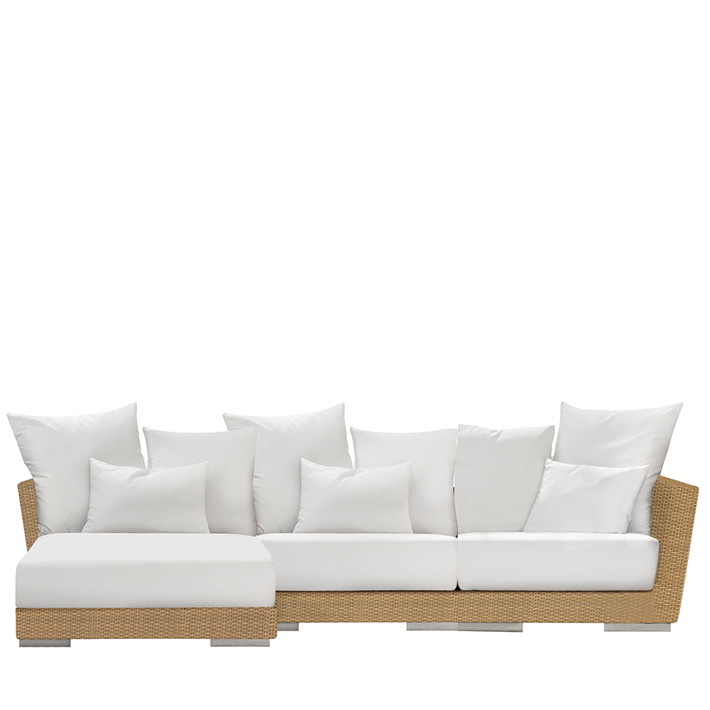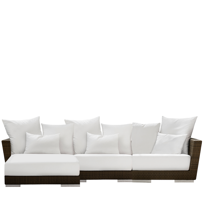 Materiales: tejido Tropilene / asiento tapizado en tela Sunbrella y acojinamientos para exterior.