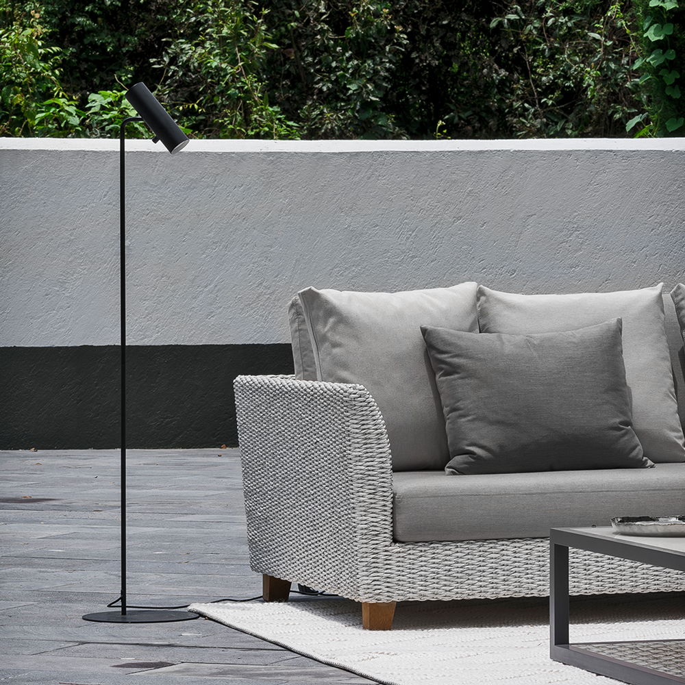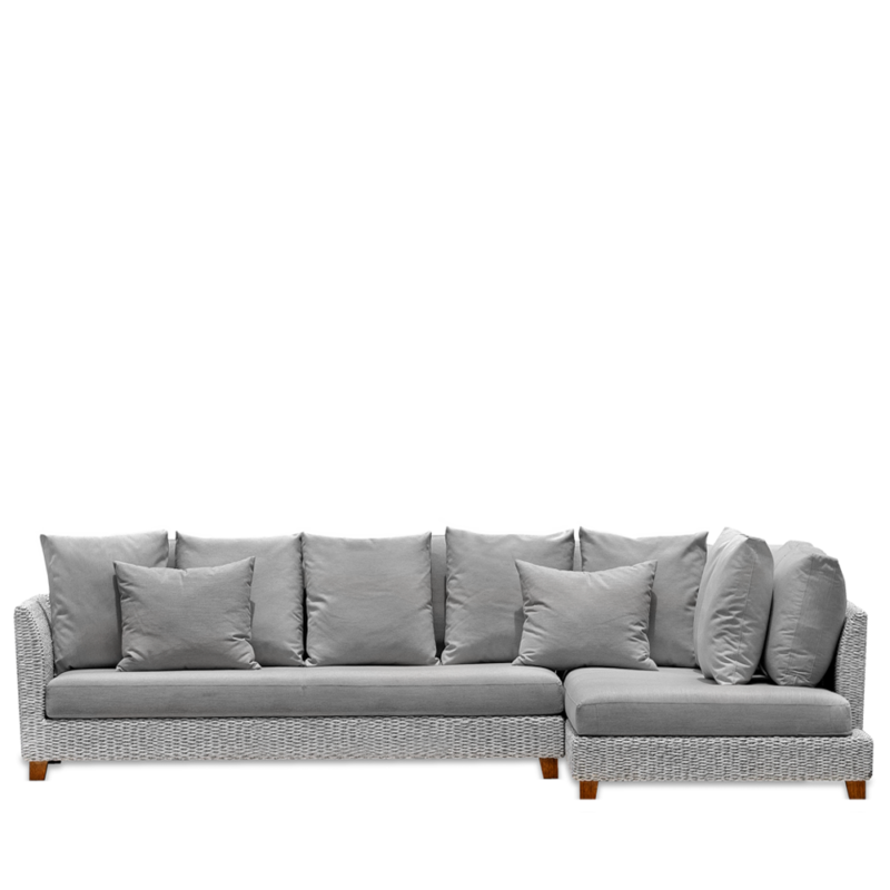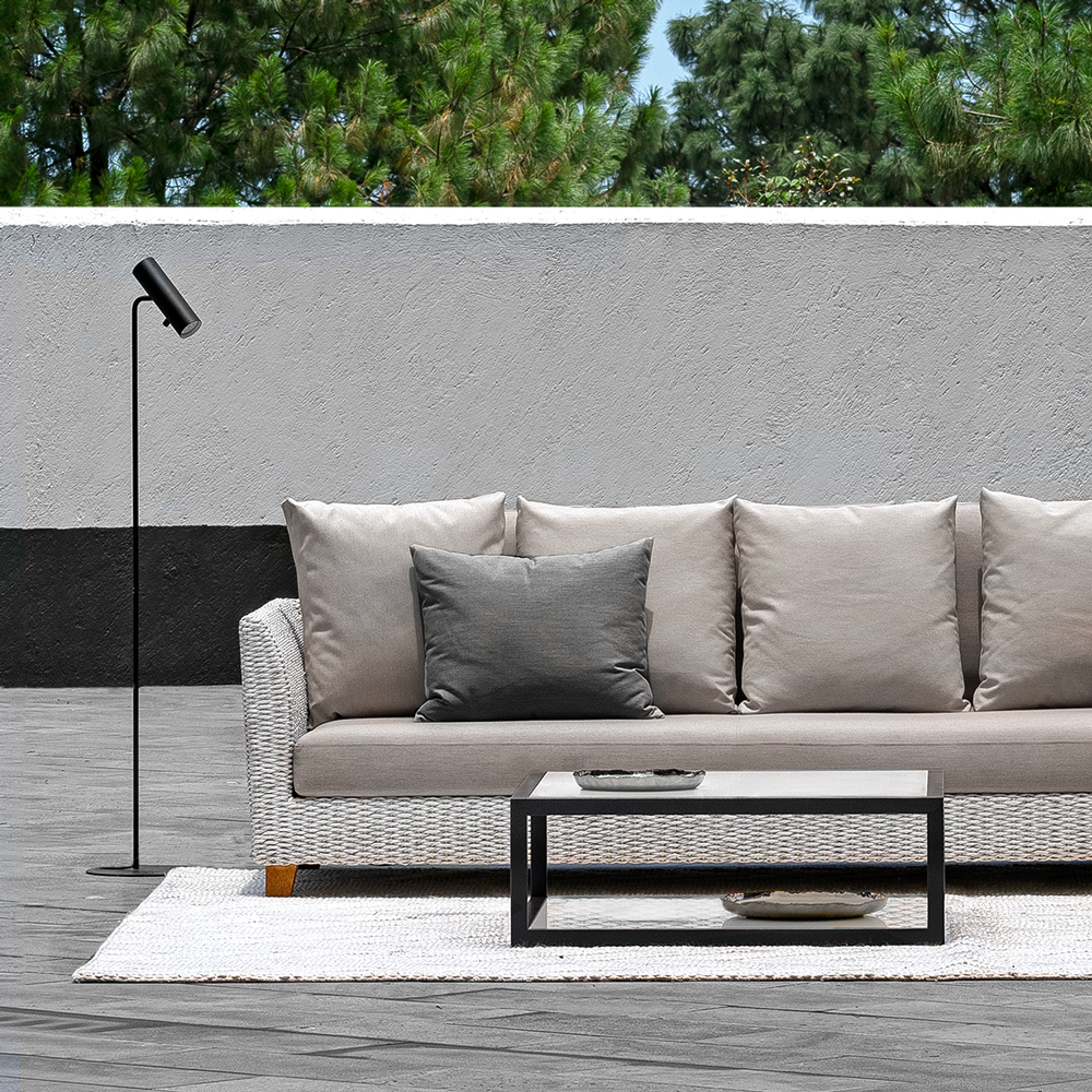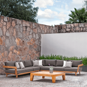 Es perfecta para la terraza. Hemos usado tela Sunbrella que resiste los rayos del sol sin decolorarse y es muy fácil de lavar, además la fibra tejida de esta escuadra resiste a la intemperie conservando su color y forma original.