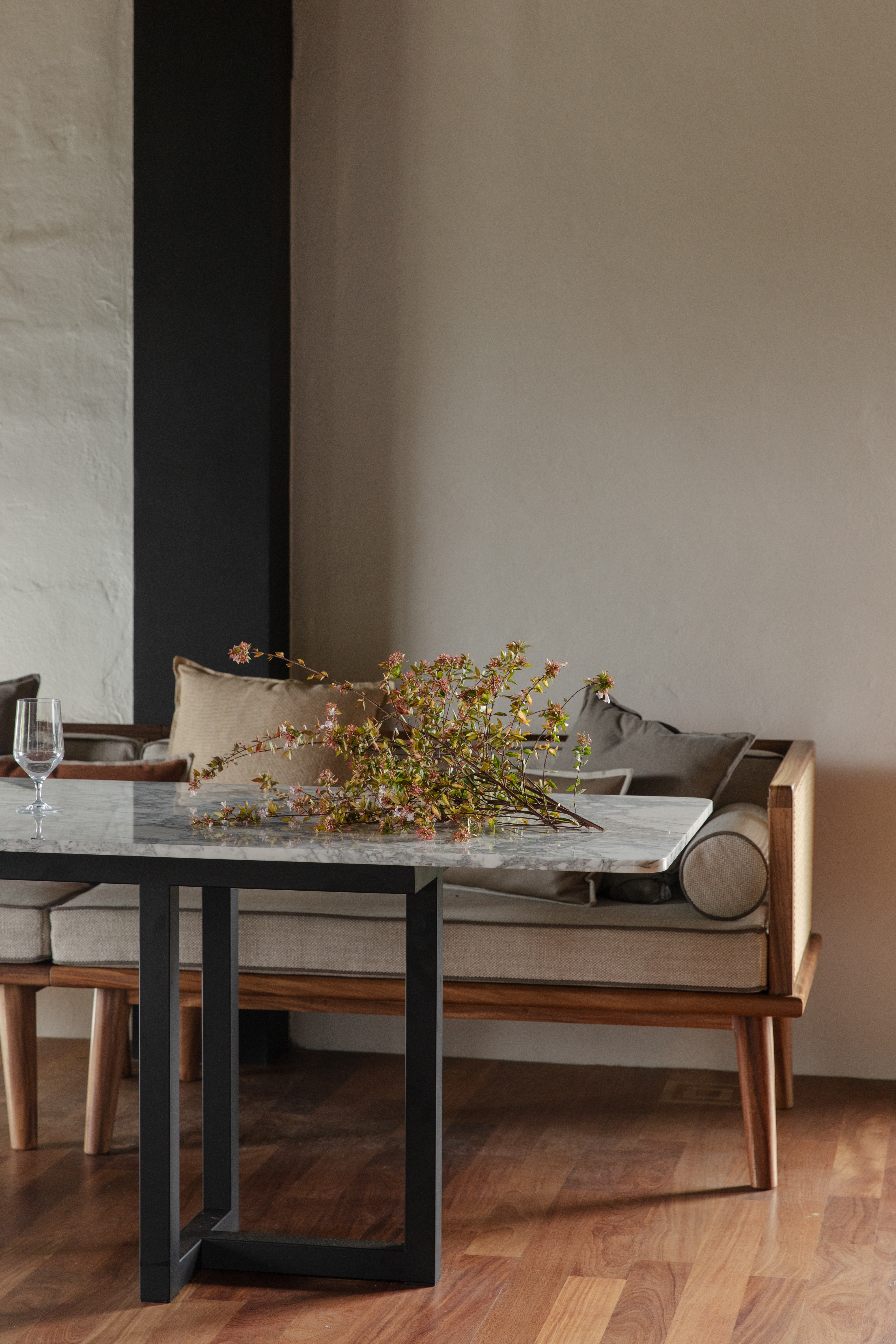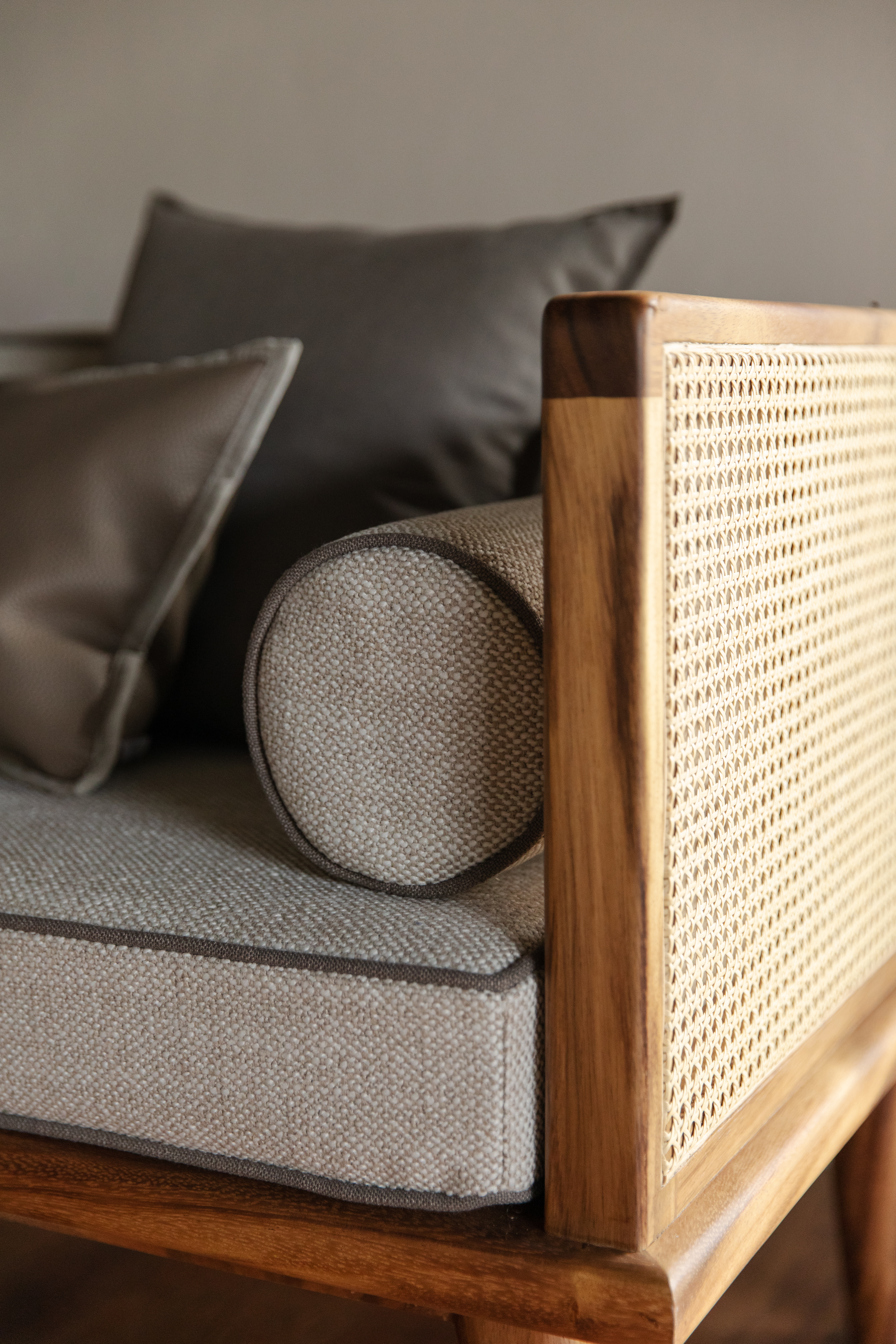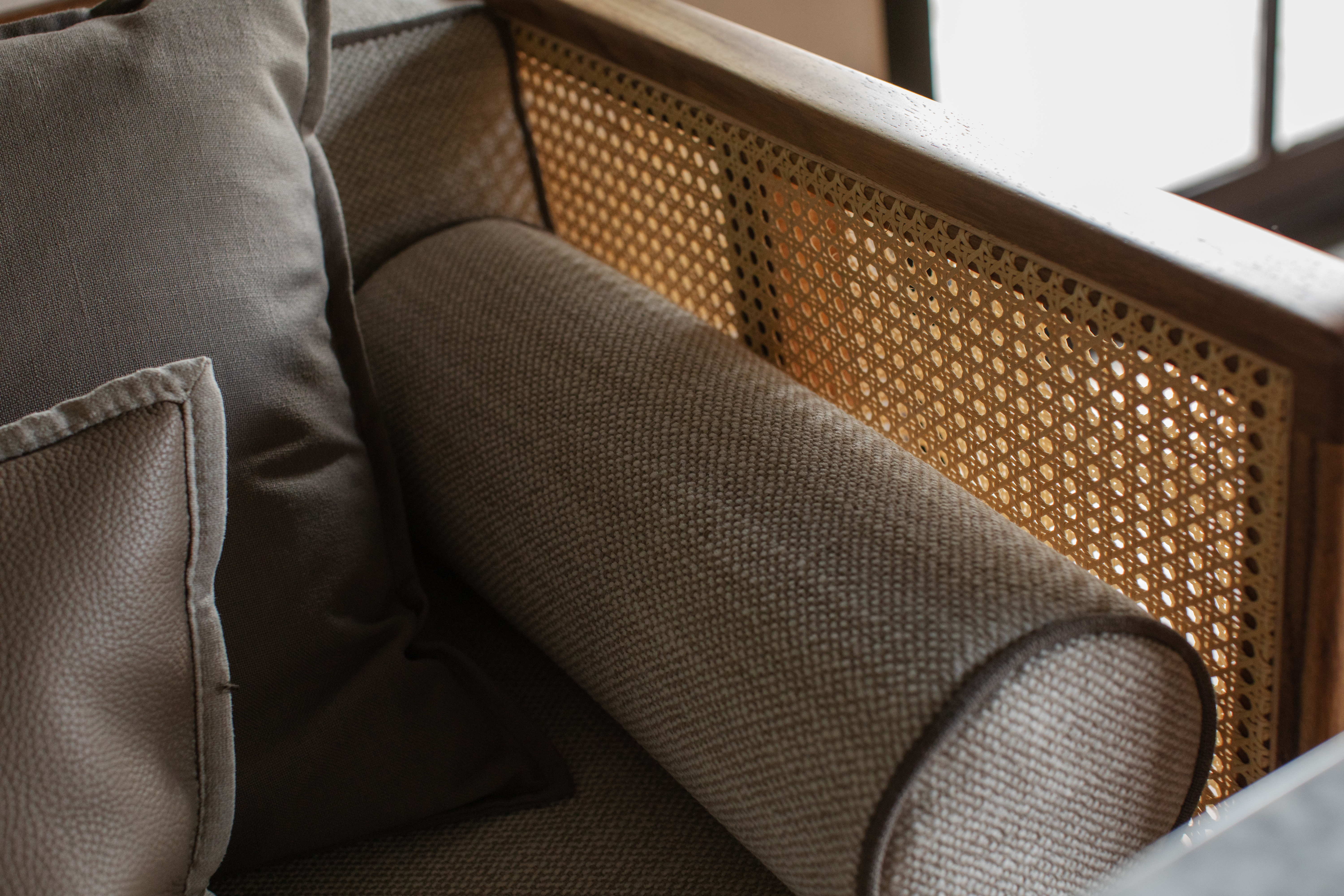 EL sofá Reserva es muy cómodo gracias a sus acojinamientos de pluma de ganso en asientos y respaldo, junto con nuestro tejido Bejuco lo que también lo hace muy fresco.